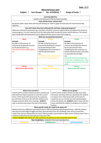 Planning' section of this template, recording the details of the discussion. 11 | blank lesson plan template (pdf version and editable version with instructions). Suitable for any year group in primary, and adaptable for secondary. Questions for the post lesson discussion: The supervisor and teacher meet to discuss, plan and agree on the lesson/teaching and learning experience and the two to four standard descriptors to be observed. Ofsted doesn't expect you to use its inspection criteria to grade lessons. It may also be helpful to plan and develop ideas for a lesson that may be observed. Lesson plans ~ kindly keep an orderly compilation of all lesson plans that you develop. I had to plan a lesson for an assessment for my teacher training course and found this the most useful template out there. These plans are reviewed frequently during the observation process, by both the site director and mentor teacher. Lesson (complete) 4.4 7 reviews. *please note this resource is suitable for australian teachers, as it is aligned to the australian teaching standards these lesson observation feedback templates are a fantastic professional addition to your prac folder. These lesson plans will be evaluated according to format.